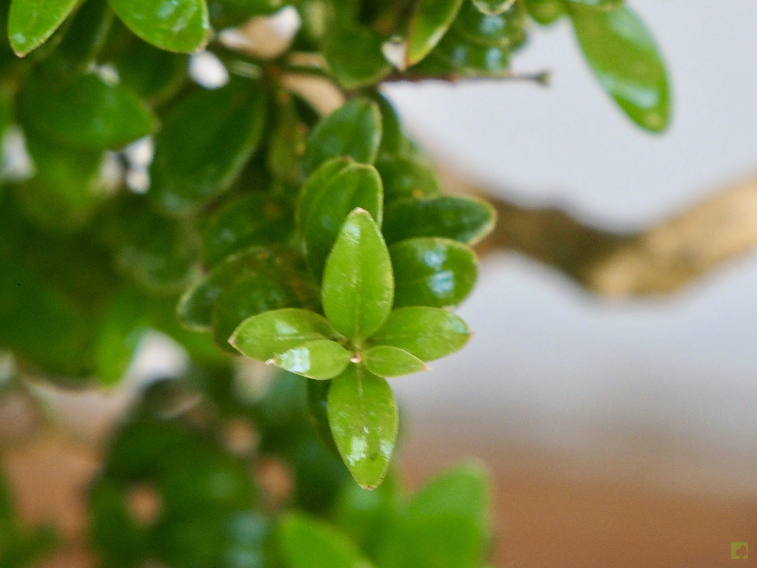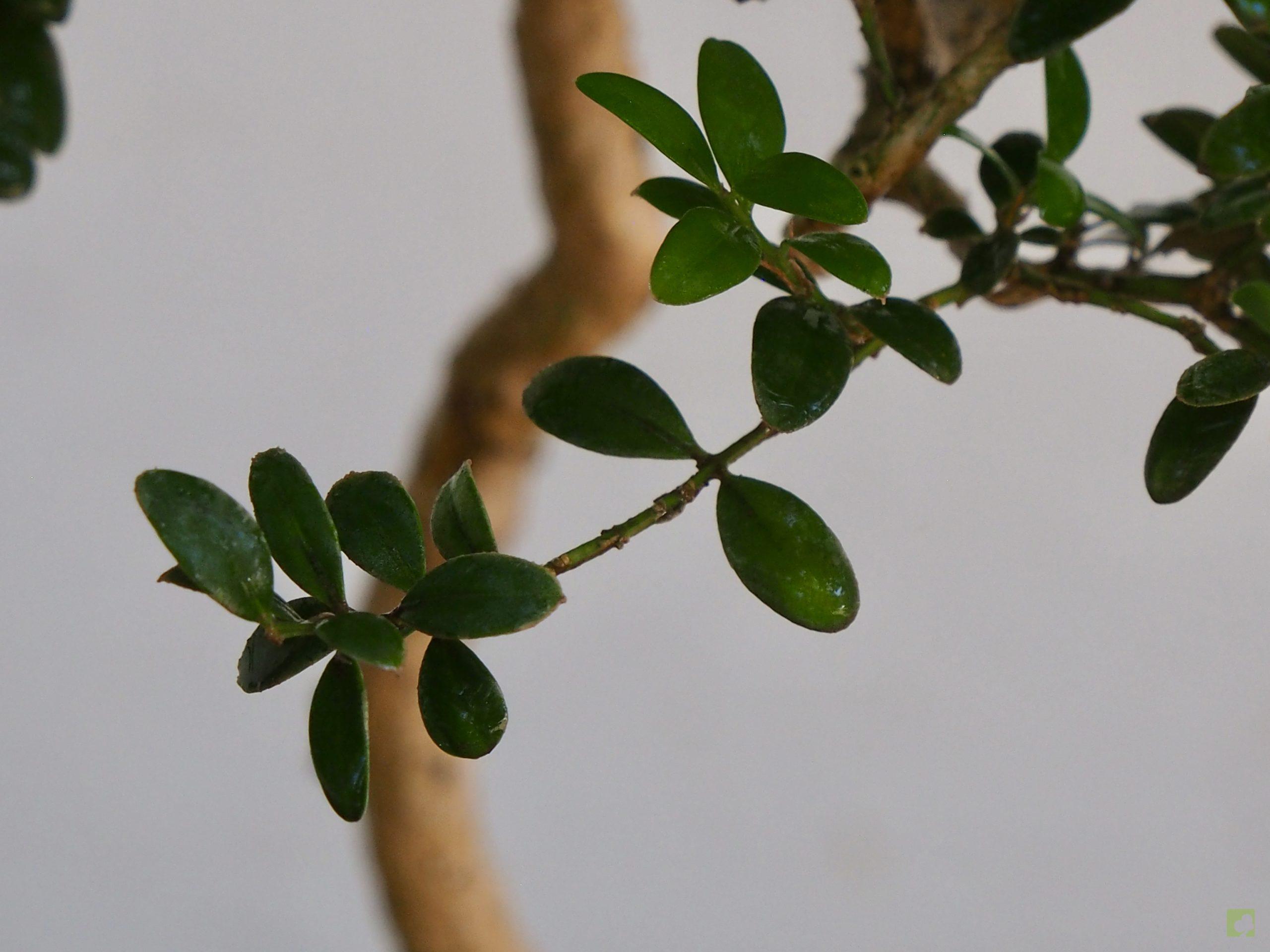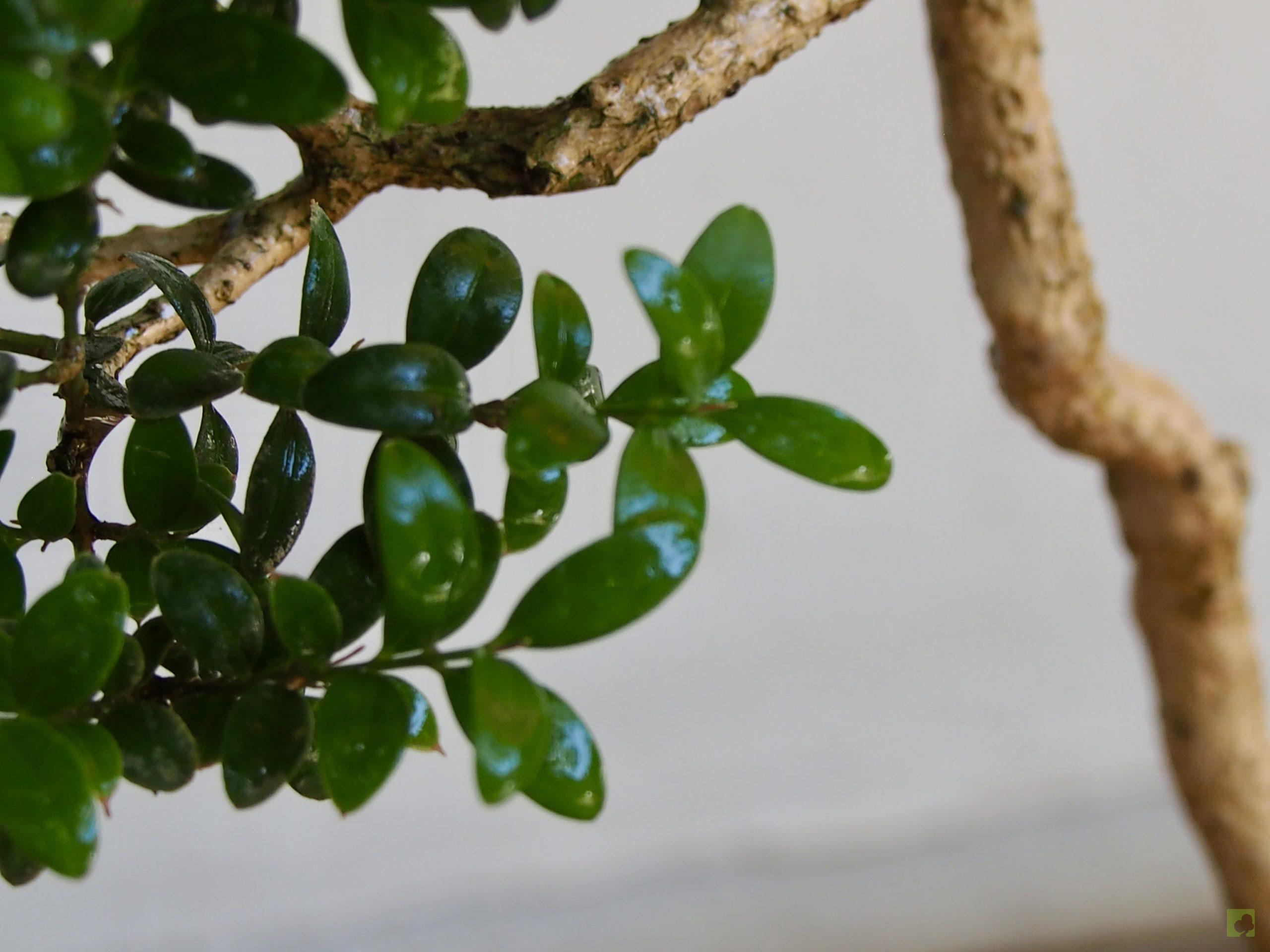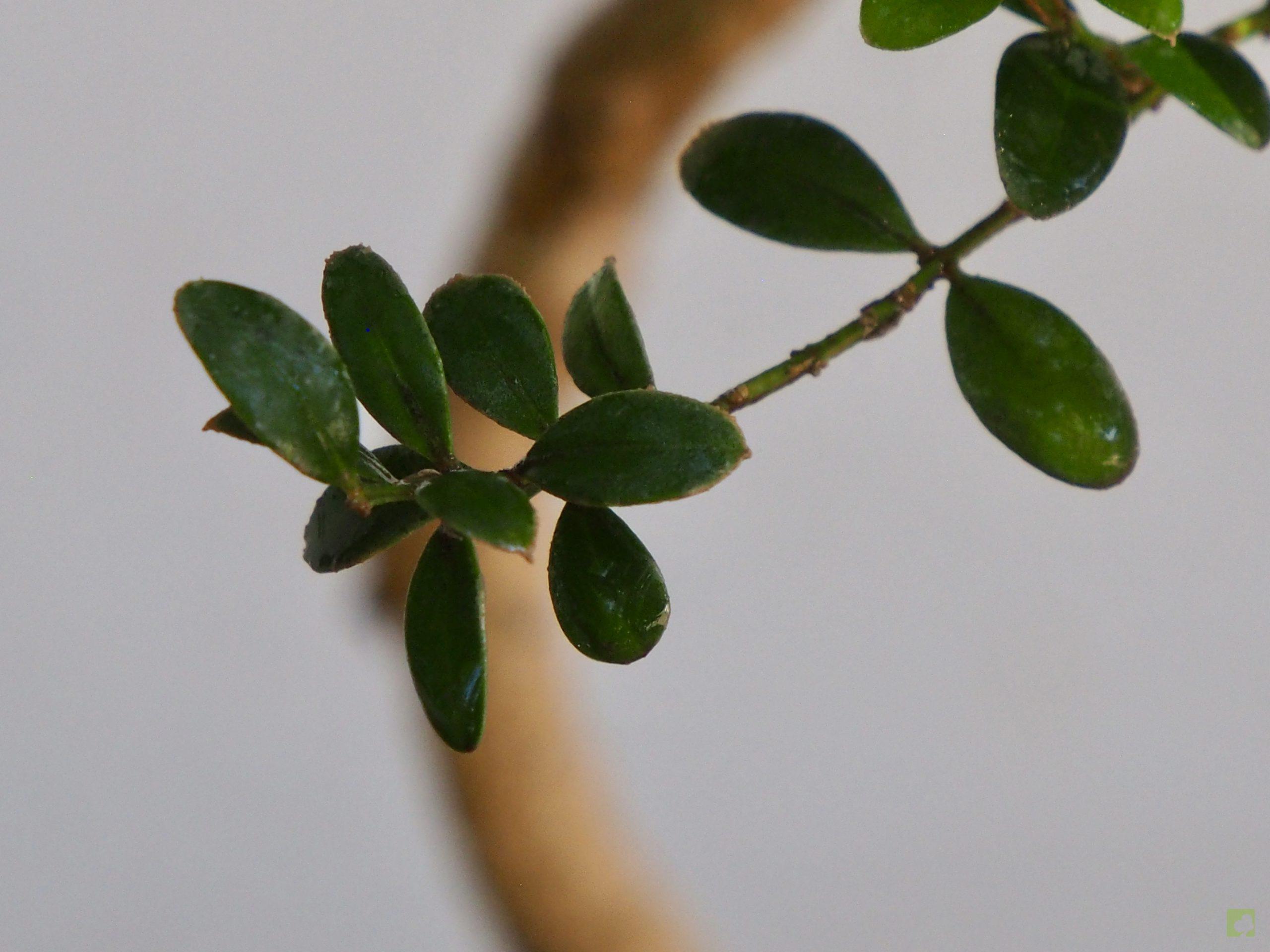 Sus hojas son enteras, opuestas y coriácia. Son de color verde oscuro lustroso por la haz y más pálidas por el envés, con los bordes ligeramente enrollados.