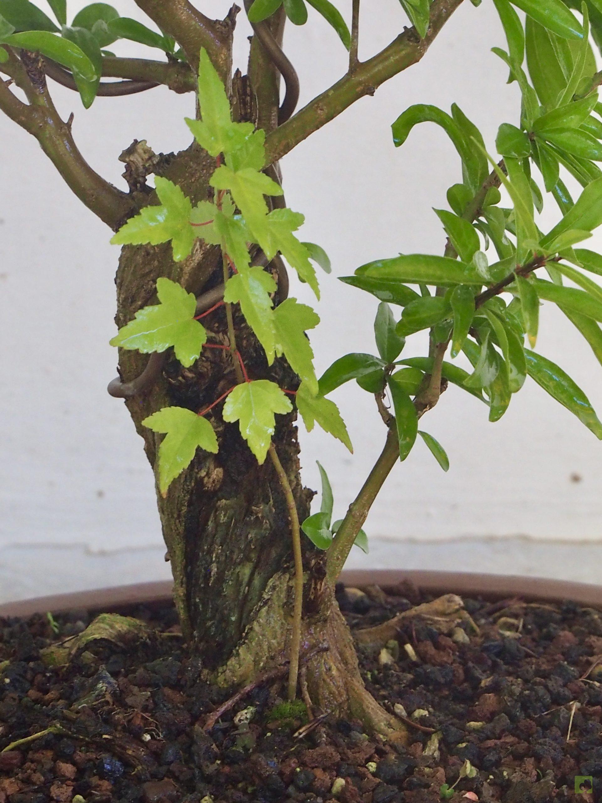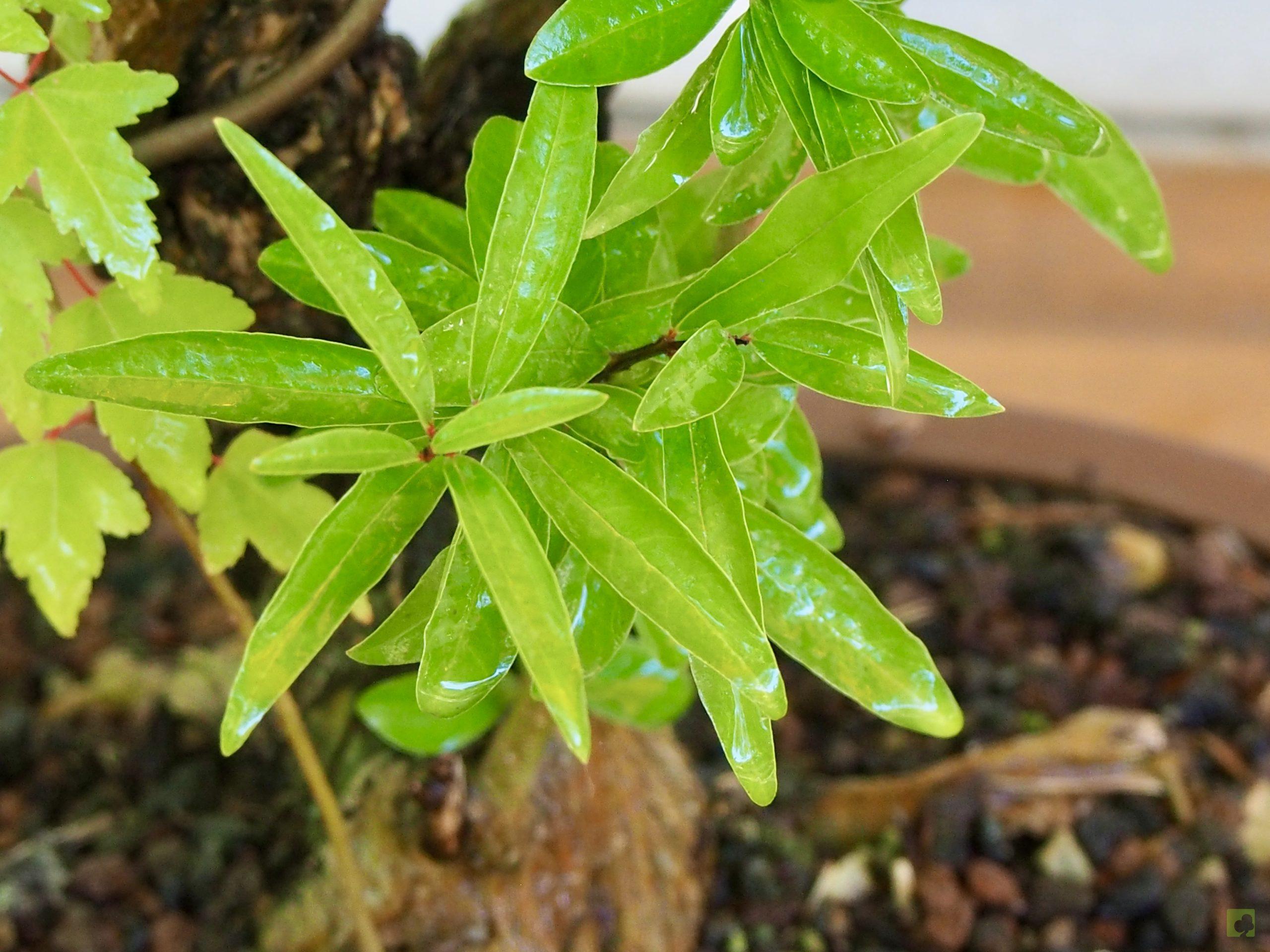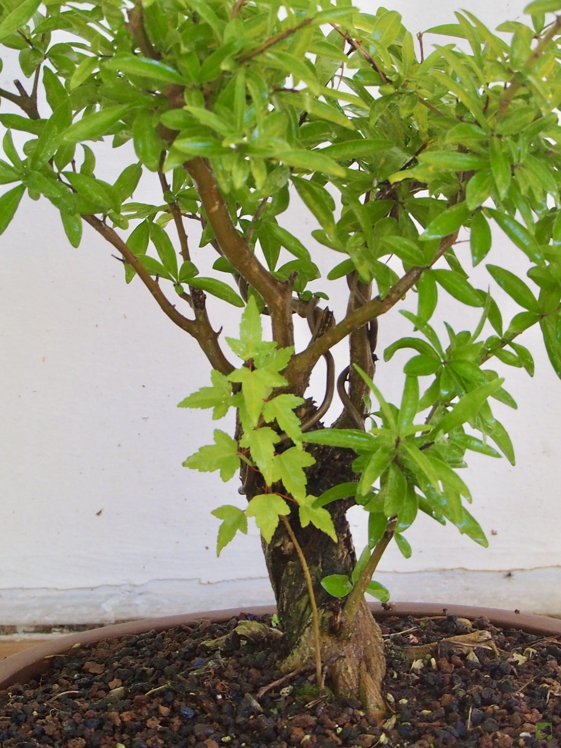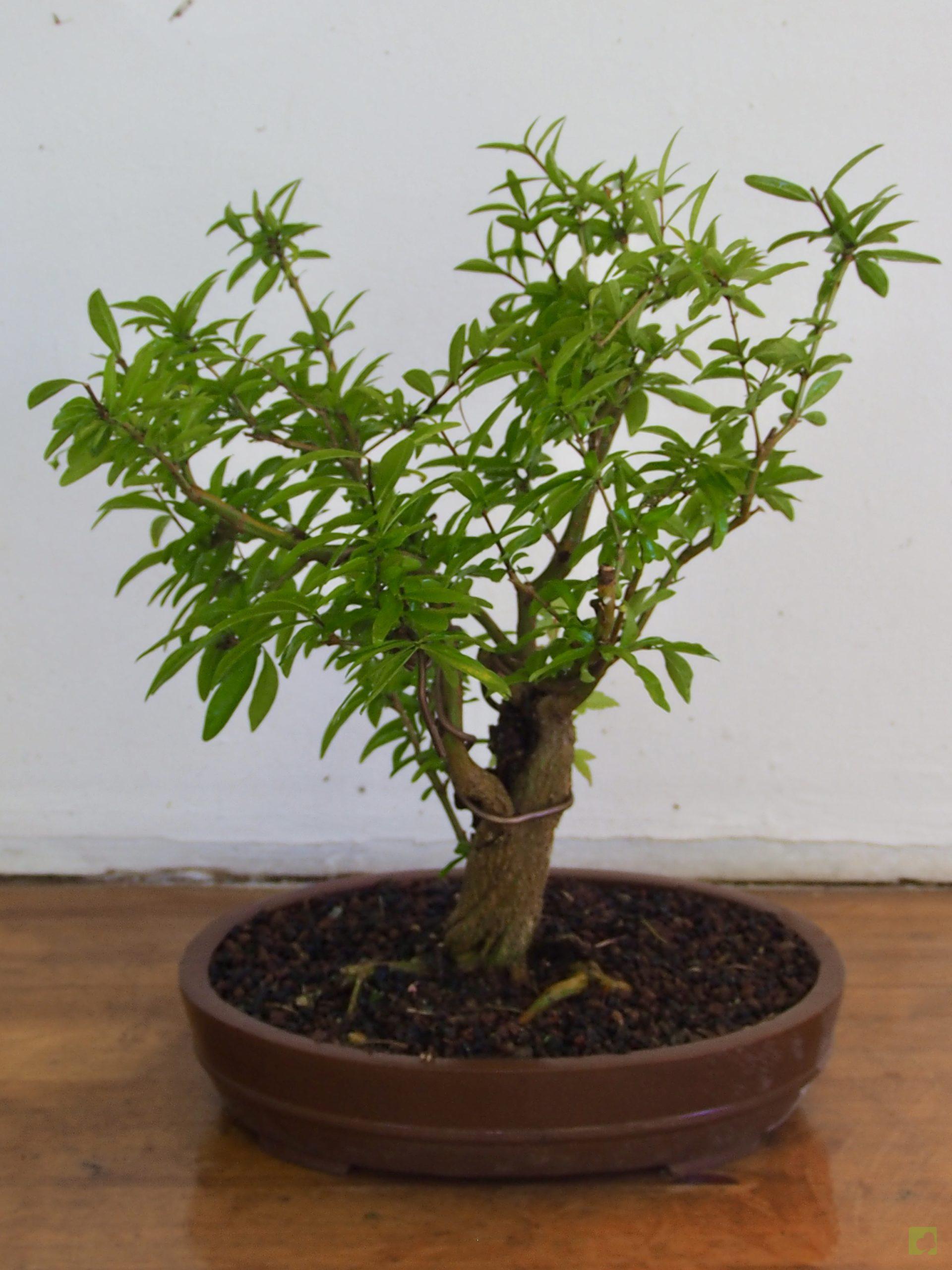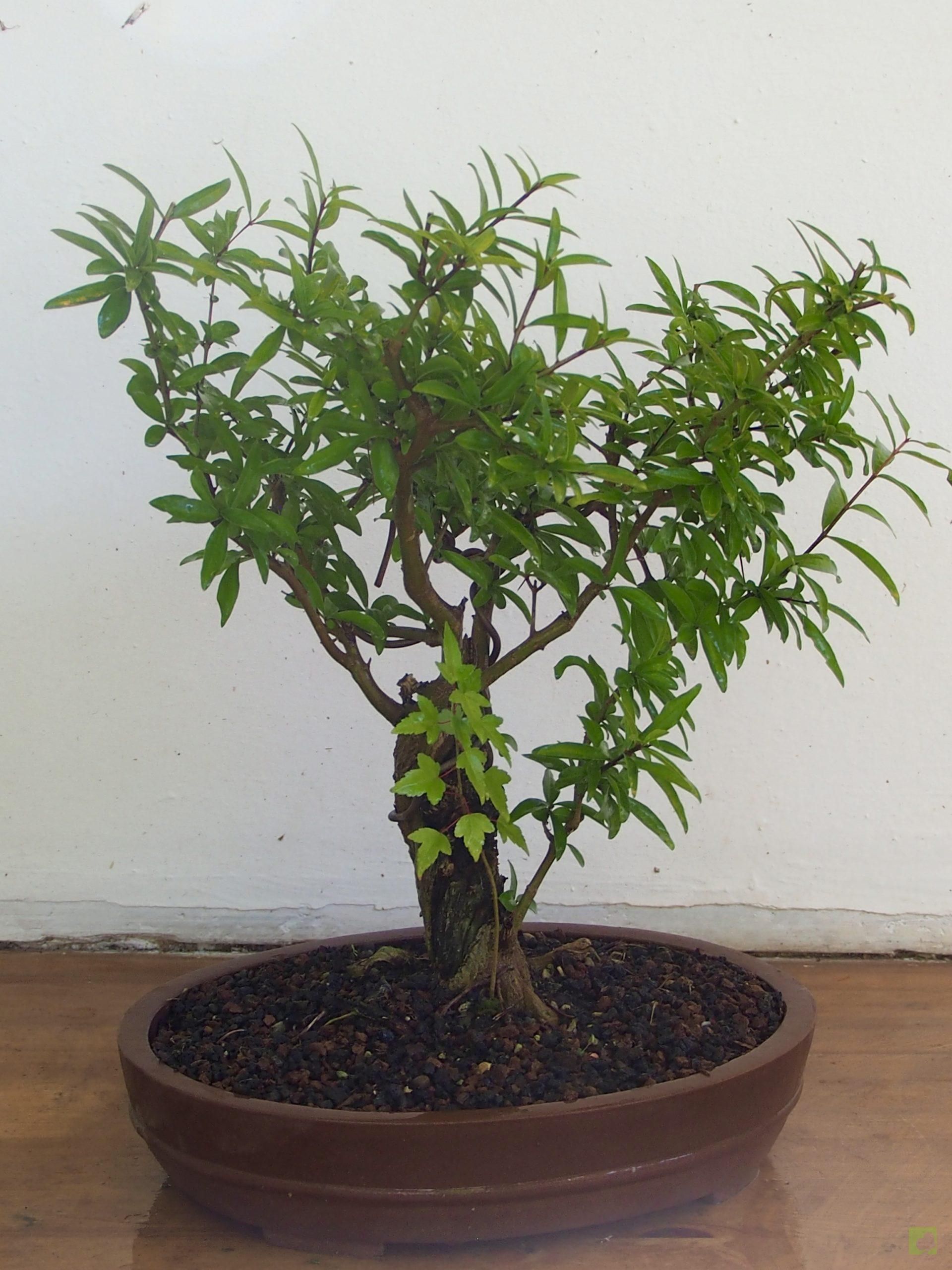 – El Granado es un árbol caducifoliio. Hojas oblongas y brillantes, situadas sobre ramas ligeramente espinosas. Florece en verano con flores de un vivo color escarlata y cáliz coriáceo, aunque también pueden ser blancas, rosadas o incluso amarillentas. Su fruto, es la conocida granada, con una jugosa pulpa roja comestible. La variedad miniatura Punica granatum ‘Nana’ es muy apta y difundida. Posee hojas, flores y frutos parecidos a los del granado común, aunque todo es de tamaño mucho más reducido.