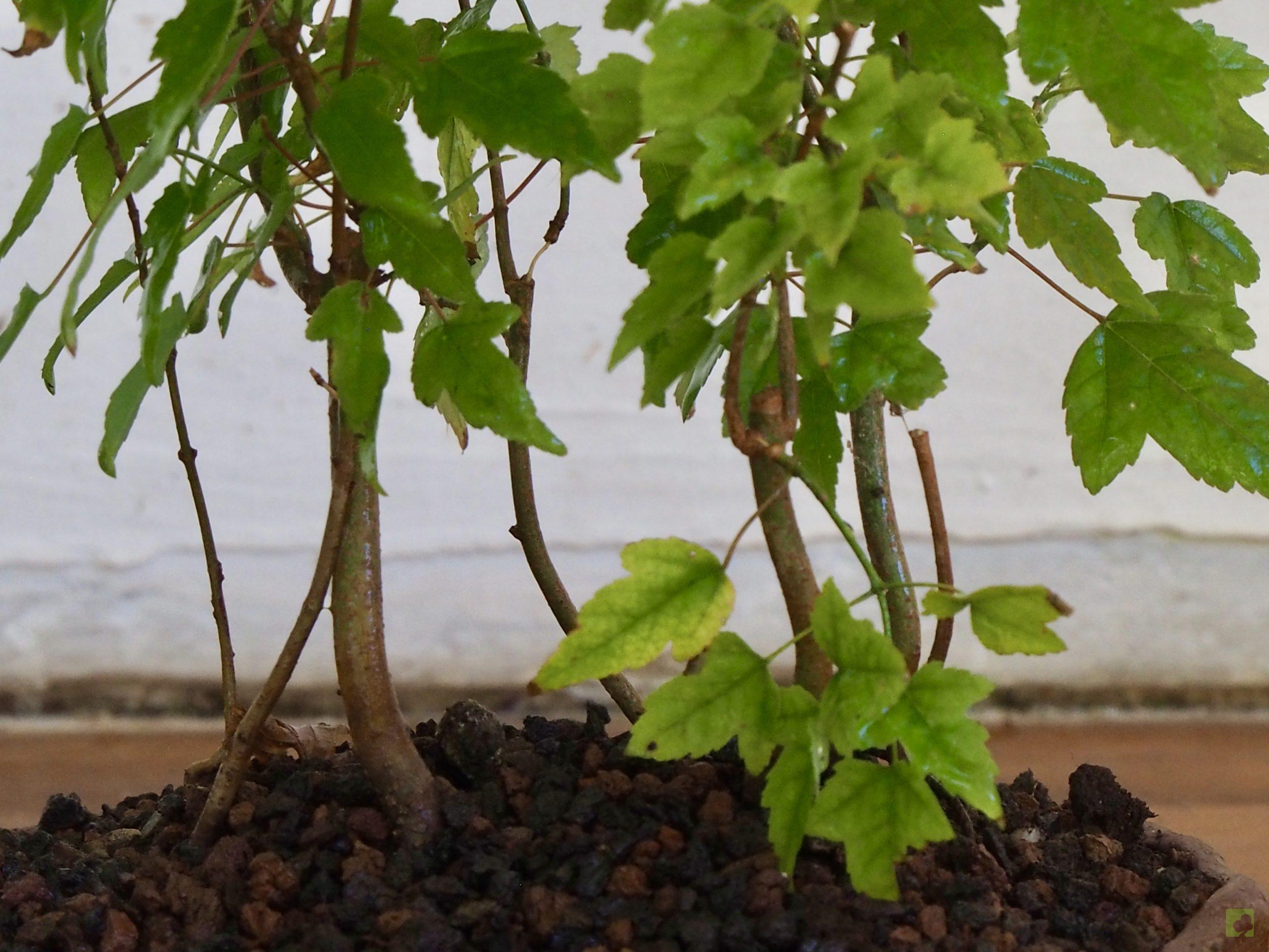 – Trasplante: Cada 2 años, y los árboles muy jóvenes anualmente. Se efectúa justo después de la caída de las hojas o antes de la brotación de las yemas. Durante el trasplante se deben las raíces podridas y eliminar bien toda la tierra vieja. Cuando la base del tronco esté limpia y a la vista, se podan completamente las raíces que nazcan directamente de dicha base. En los sucesivos trasplantes de nuestro arce debemos ir eliminando las raíces que crecen hacia abajo, dejando sólo las que crecen en horizontal, conseguiremos de esta forma una interesante base de raíces. Tras la poda de raíces está débil, por lo que no le conviene sufrir heladas. Por este motivo, se recomienda hacerlo a finales de invierno o principios de primavera.