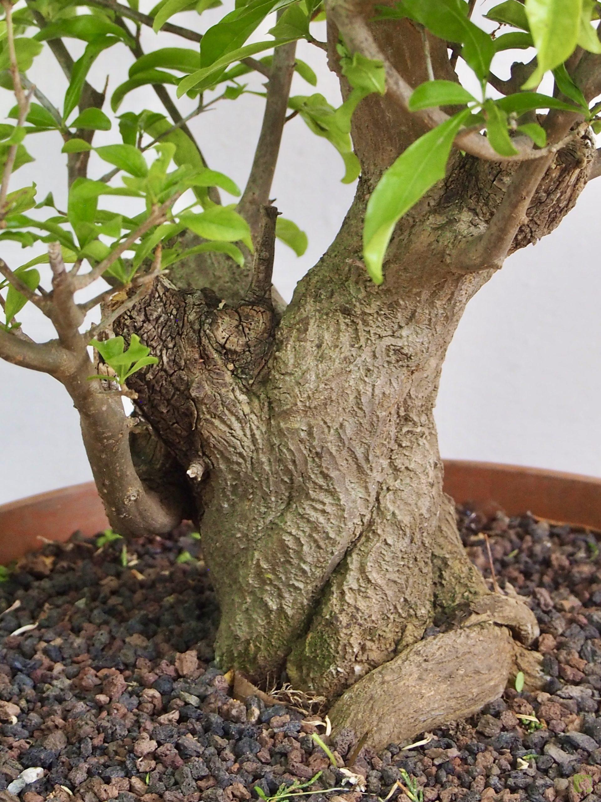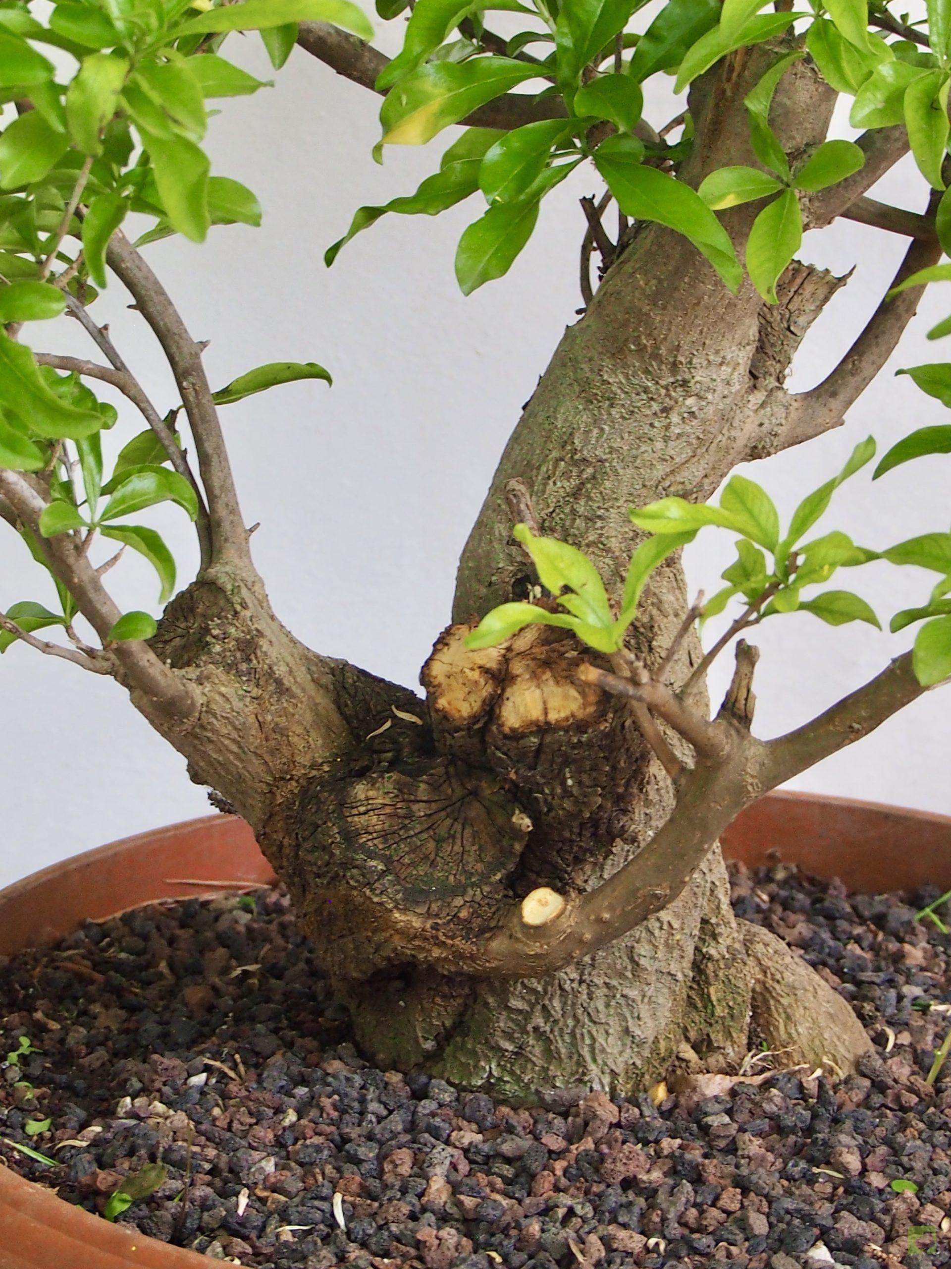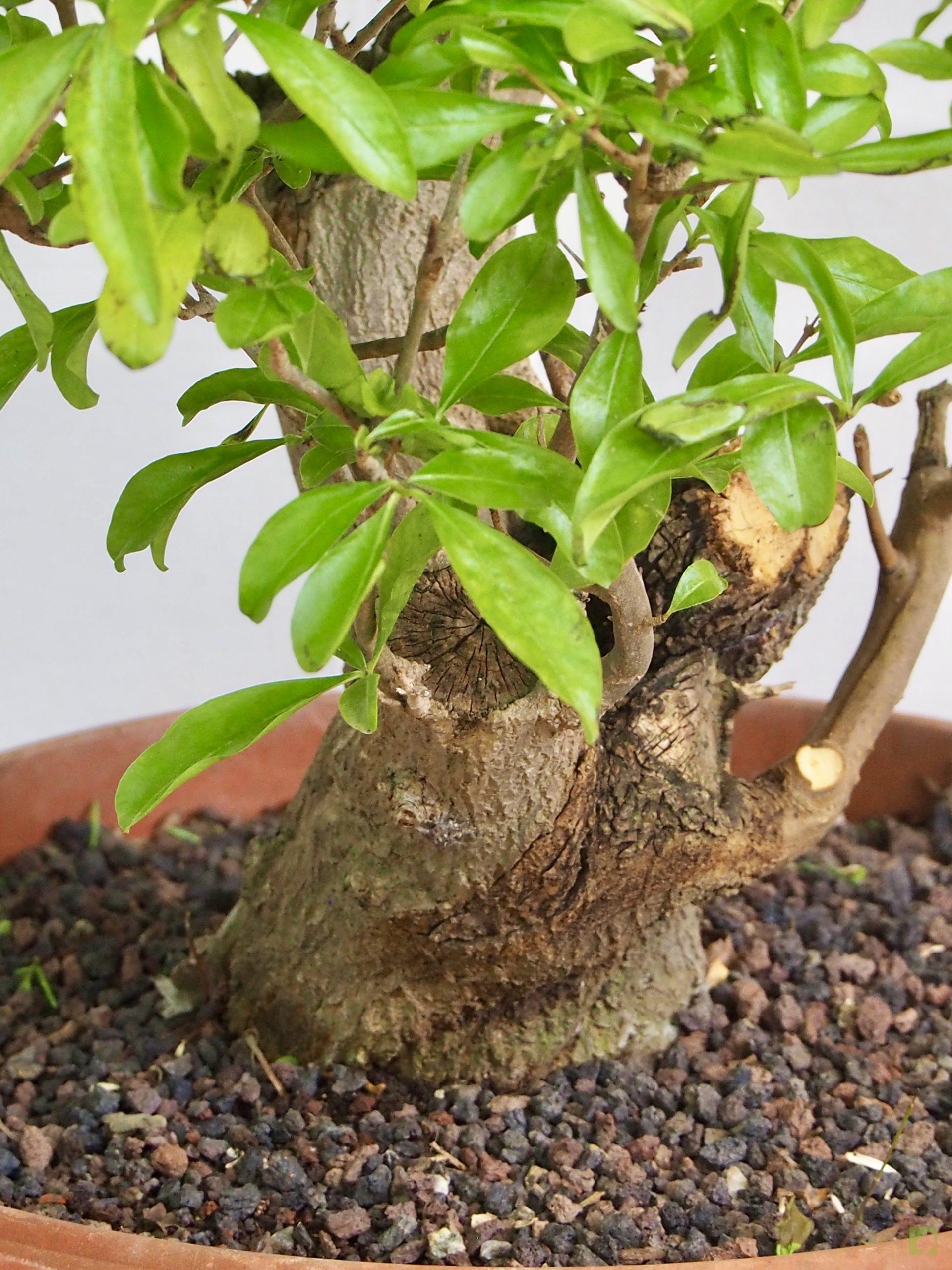 – Trasplante: Cada 2 ó 3 años, al comienzo de la primavera y en los ejemplares más viejos puede aumentarse la periodicidad a 3 años. La época idónea para efectuarlo es cuando el árbol haya brotado con un par de hojas. Durante el trasplante conviene sanear bien cualquier parte de raíces podridas. Es necesario cambiar la tierra agotada, realizando un desenredo de las raíces y recortando un tercio de las mismas. Podar las raíces durante el trasplante pero sin cortar demasiadas raíces finas para permitir que pueda recuperarlas durante el invierno. Si el árbol está sano y es joven, una poda drástica de raíces suele estimular el crecimiento de nuevas y, por tanto, el rejuvenecimiento del árbol, pero en el caso del granado es conveniente evitar la poda de raíces gruesas para evitar que se sequen ramas importantes. Si cortamos una raíz gruesa, no veremos ningún efecto inmediato pero al cabo de los años la corteza se irá secando poco a poco hasta que la rama afectada muera totalmente. Entre la poda de ramas y el trasplante (o viceversa) debería existir un intervalo mínimo de tiempo para no acumular demasiadas operaciones agresivas a la vez, por ejemplo, 3 semanas. Es conveniente proteger el árbol después del trasplante durante un par de meses, situándolo en un lugar muy bien iluminado pero evitando las exposición directa al sol.